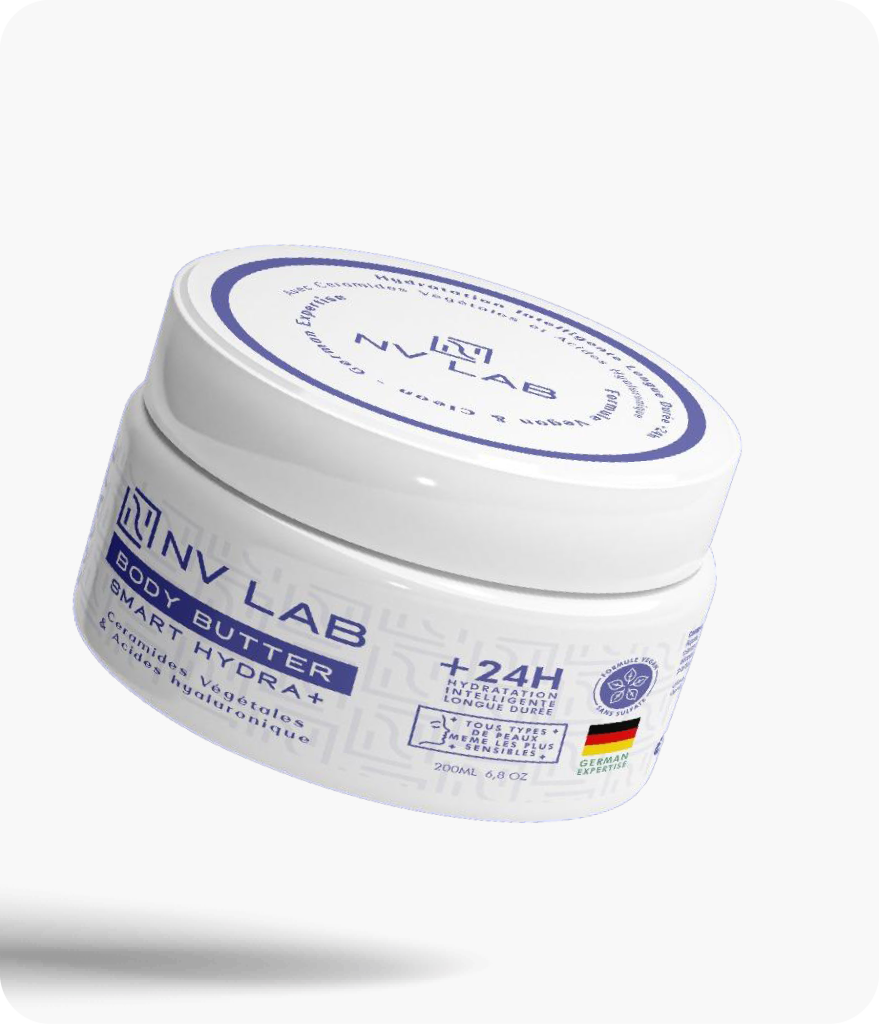 Le Body Butter Smart Hydra+ NV LAB combine acide hyaluronique, céramides et Vitamine E pour une hydratation longue durée et une barrière cutanée renforcée. Sa texture fondante et non grasse offre une sensation de confort immédiat tout en laissant la peau douce et protégée. Idéal pour tous les types de peau, usage quotidien après la douche.